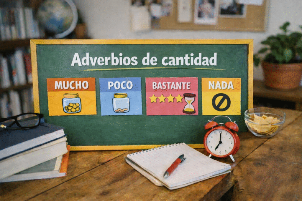 Los adverbios de cantidad indican cuánto o en qué grado ocurre una acción, o el tamaño/numero de una cosa. Se usan para modificar verbos, adjetivos o otros adverbios.